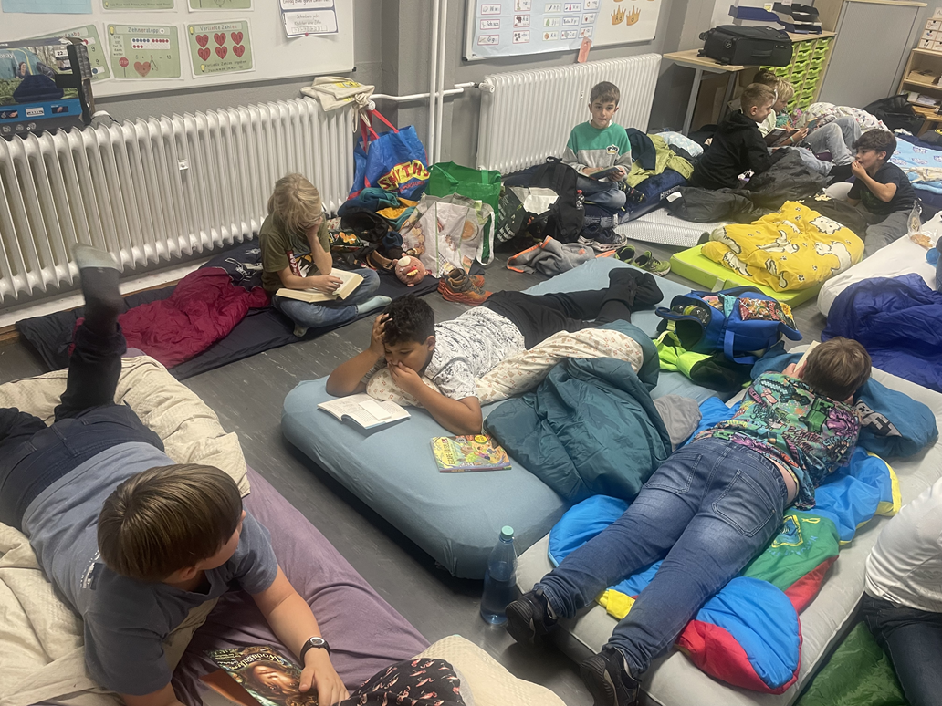 Bei der Schulübernachtung wurde es kuschelig. Wir haben gemeinsam gespielt, gegessen und gelesen.